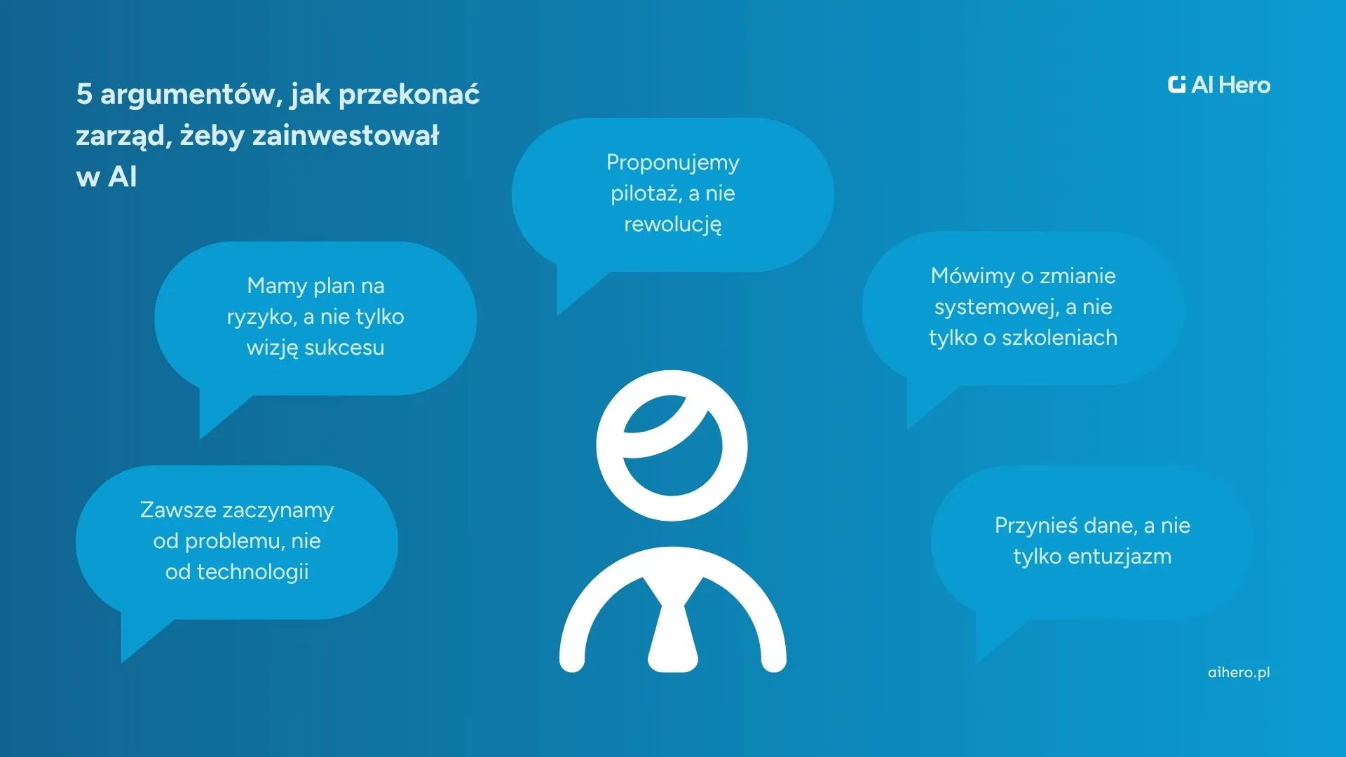 To kluczowy insight, o którym w AI Hero mówimy od wielu miesięcy (i mamy wrażenie, że wciąż za mało). Wyjaśnij, że same licencje i szkolenia nic nie dadzą bez zmiany procesów i nawyków. Pokaż, że masz plan na wsparcie ludzi, przeprojektowanie sposobu pracy i mierzenie adopcji, a nie tylko na „dostarczenie narzędzia”.